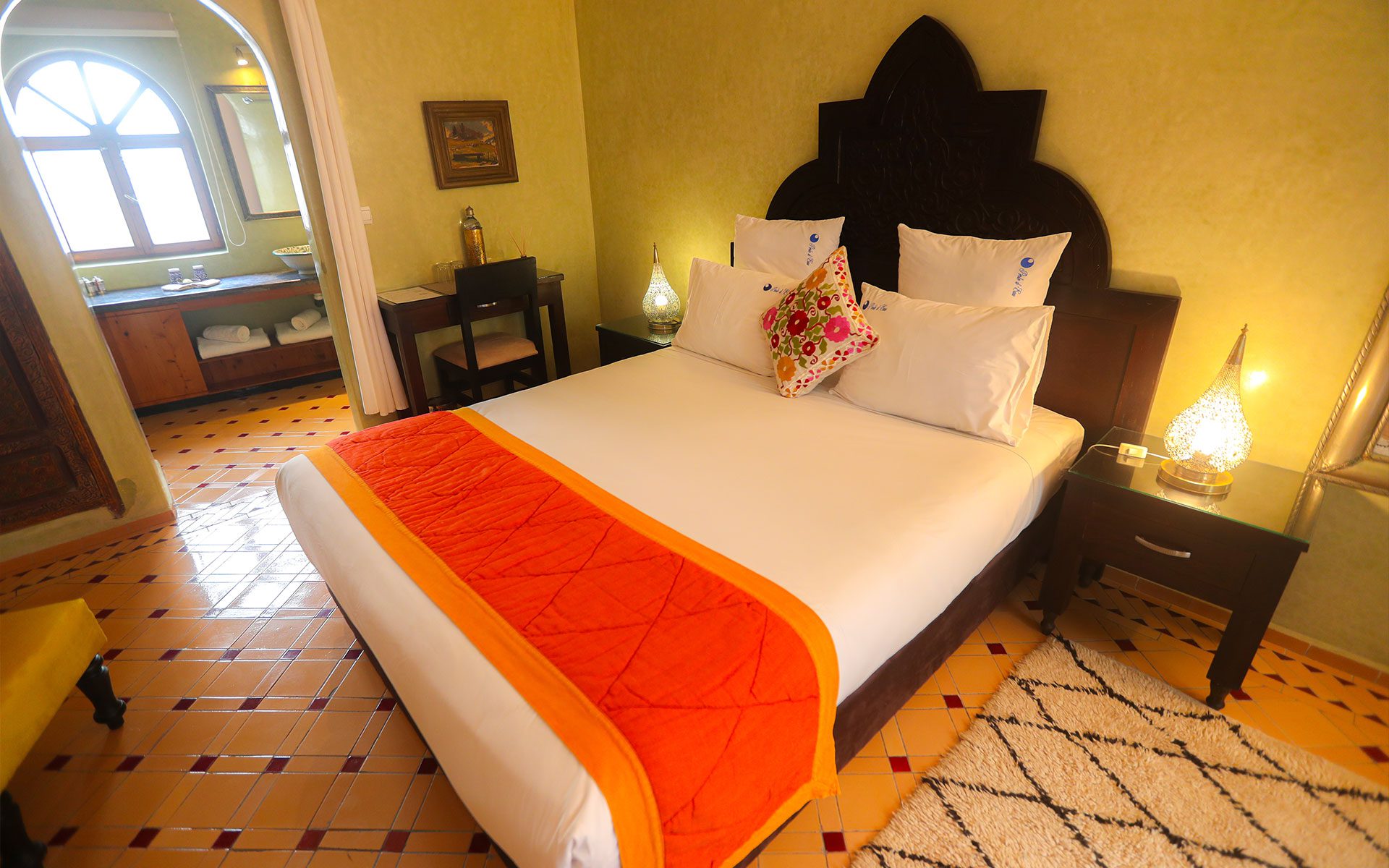 Discover the Jade Room, an invitation to a peaceful getaway where every detail is designed for your comfort. Nestled on the second floor of the Riad Medina side, with an area of 35m², this superior double room offers a seating area-desk and free wifi access. Shades of jade and white evoke the freshness of the sea breeze, while the elegant furniture creates an atmosphere of absolute relaxation.