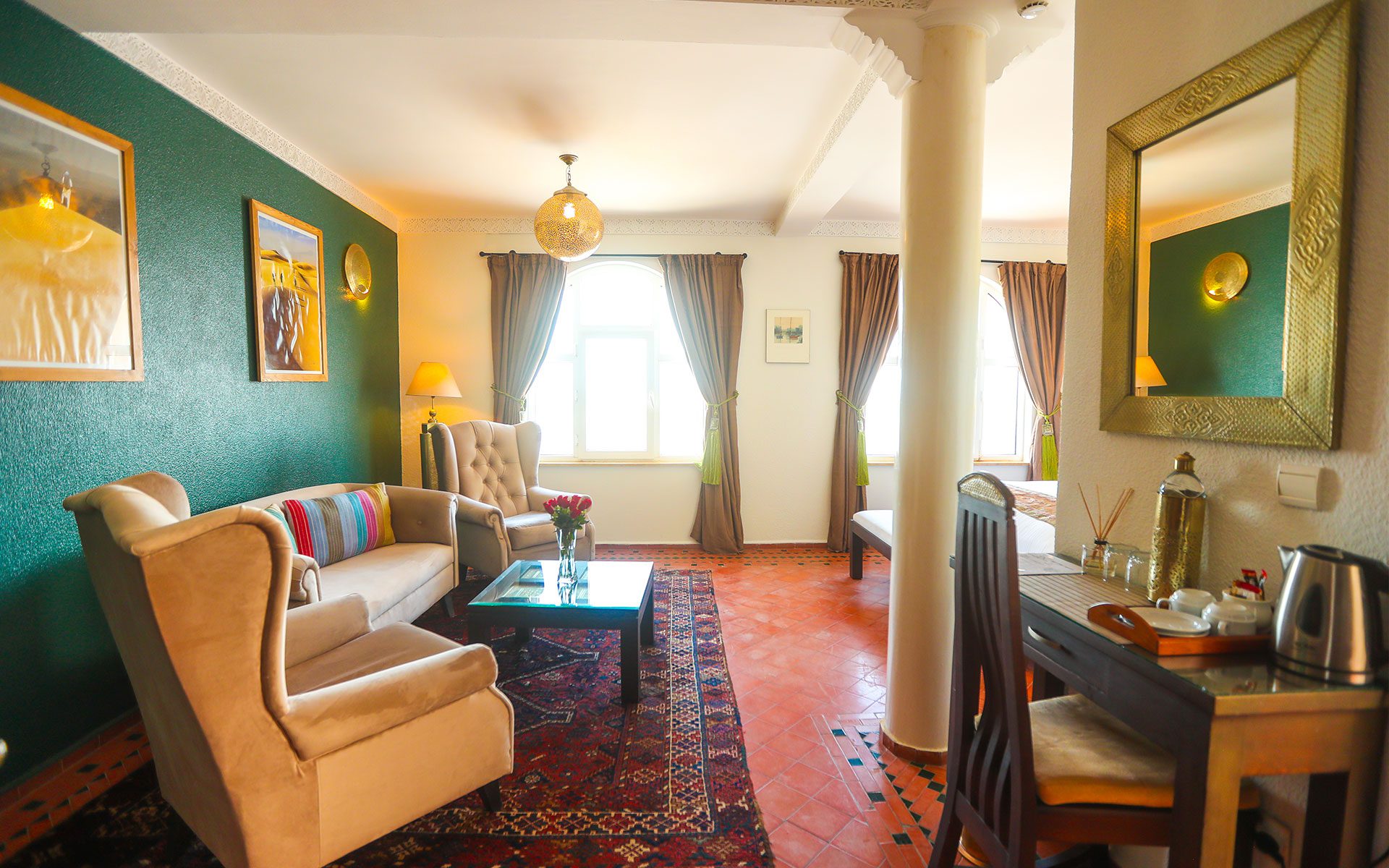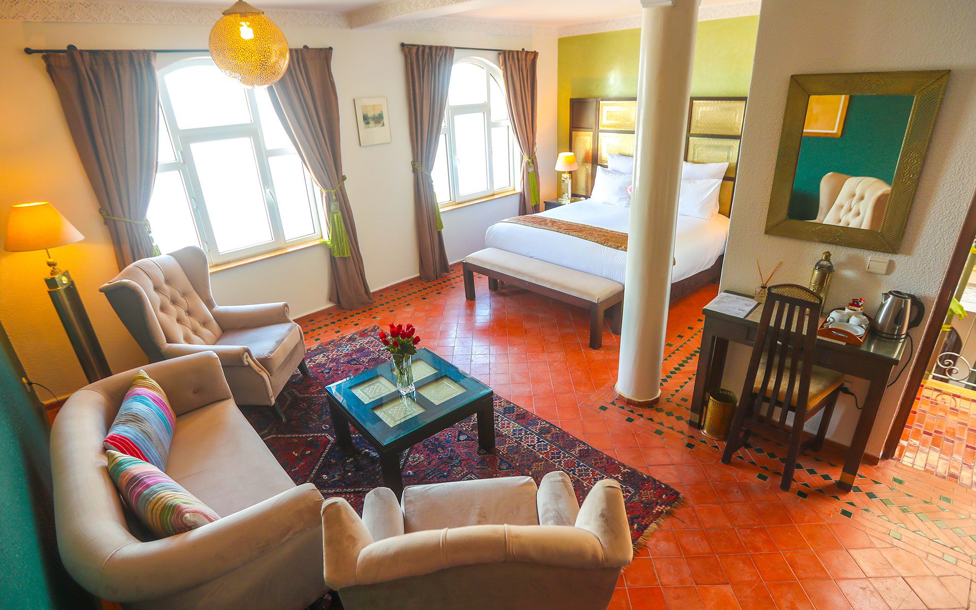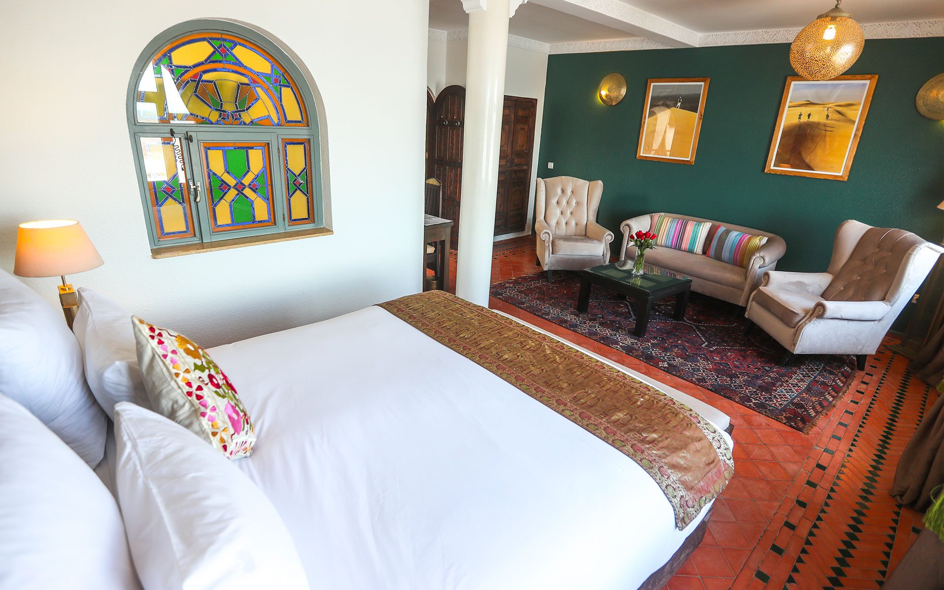 The Emerald Suite offers a unique experience for a romantic getaway or a luxury stay in Essaouira. Located on the 1st floor of the Riad sea side, this 33m² suite offers stunning views of the ocean. With a spacious seating area and free wifi access, it guarantees absolute comfort.