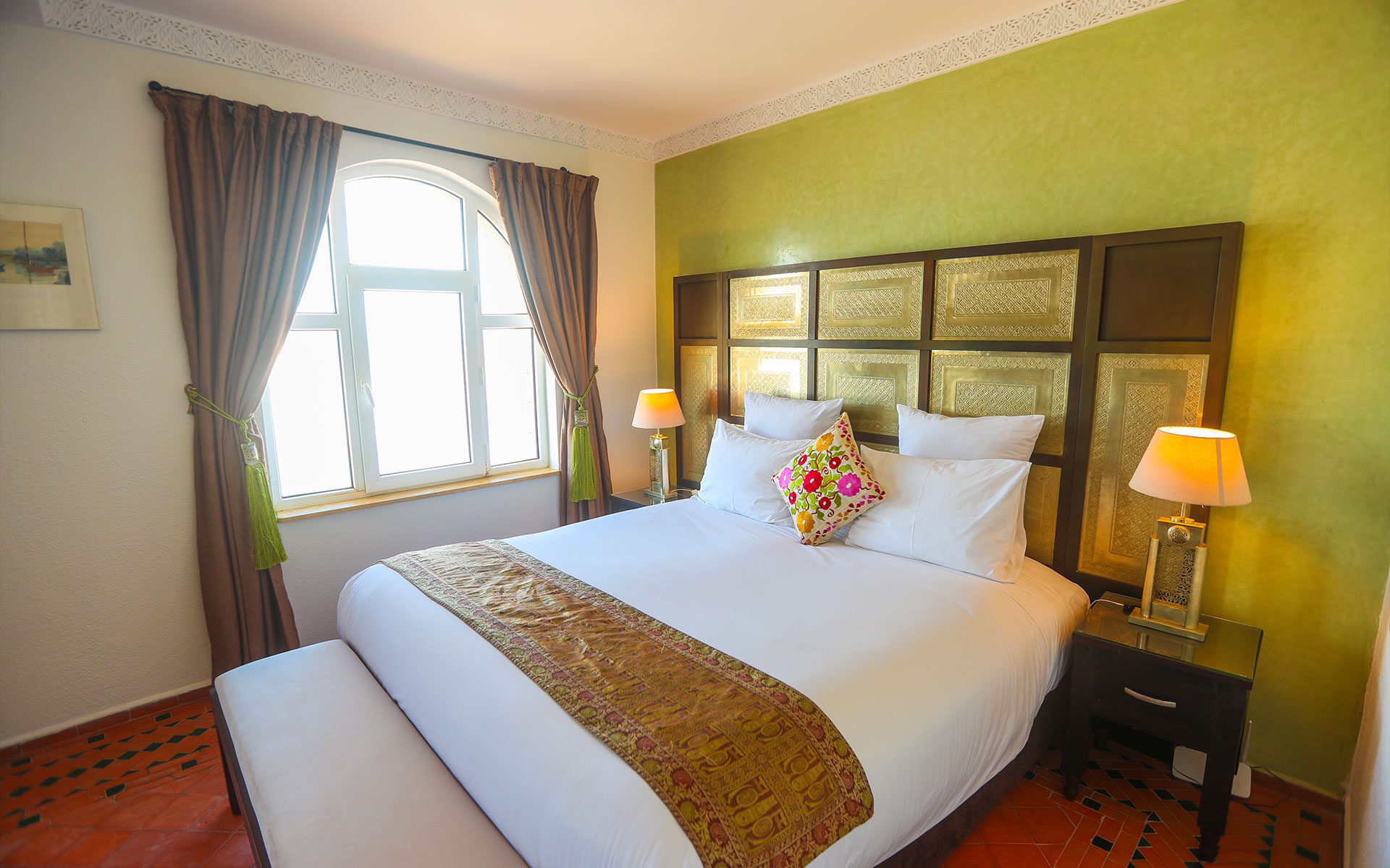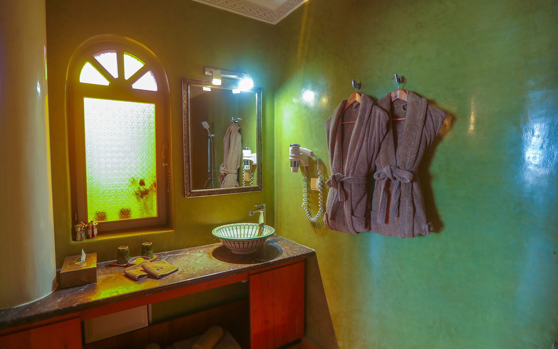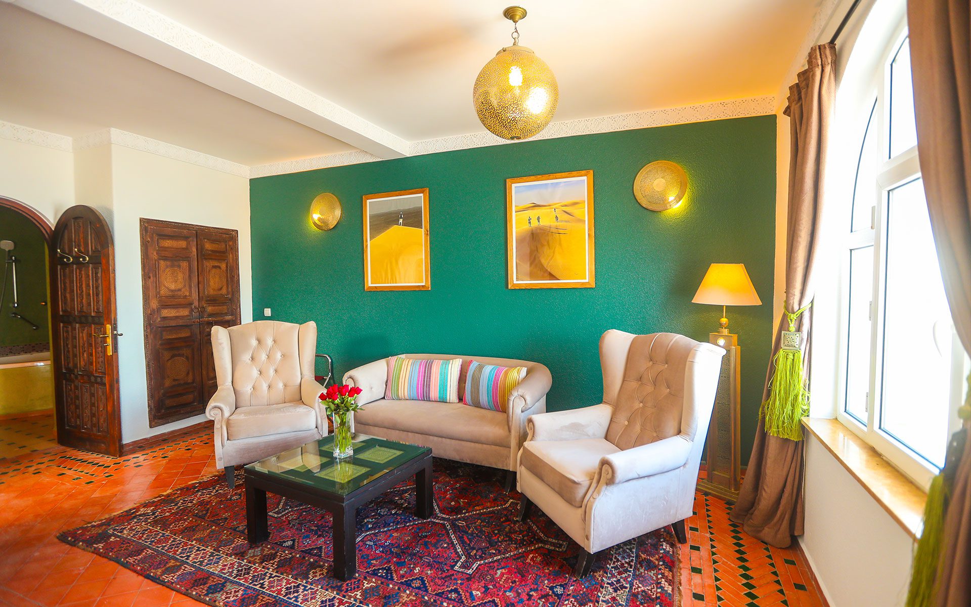 The Emerald Suite offers a unique experience for a romantic getaway or a luxury stay in Essaouira. Located on the 1st floor of the Riad sea side, this 33m² suite offers stunning views of the ocean. With a spacious seating area and free wifi access, it guarantees absolute comfort.